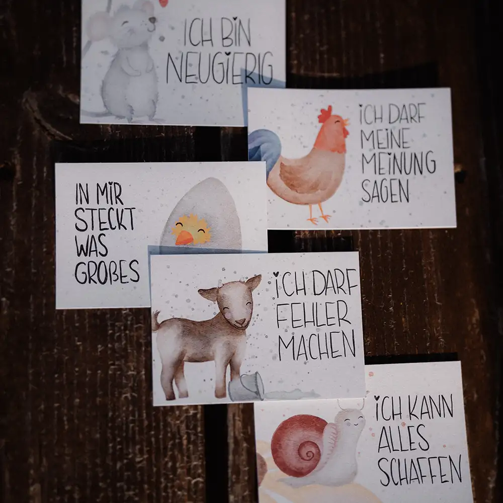 Als Morgen- oder Abendritual, in der Brotdose als Überraschung, als Gesprächsanlass oder wenn das Kind eine Karte für den Tag aussuchen darf. Die Glückssätze stärken das Selbstvertrauen, helfen bei schwierigen Phasen und schenken der ganzen Familie Momente echter Verbindung.